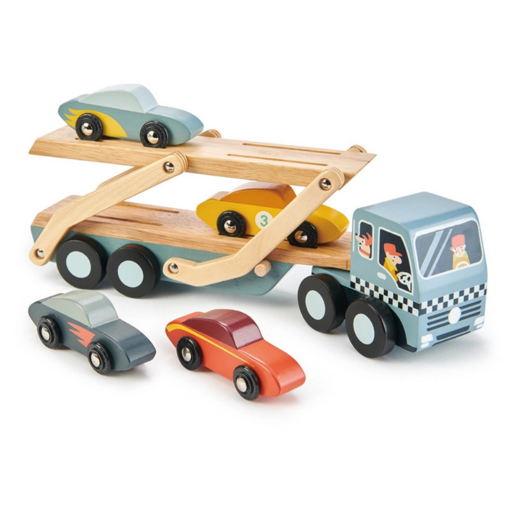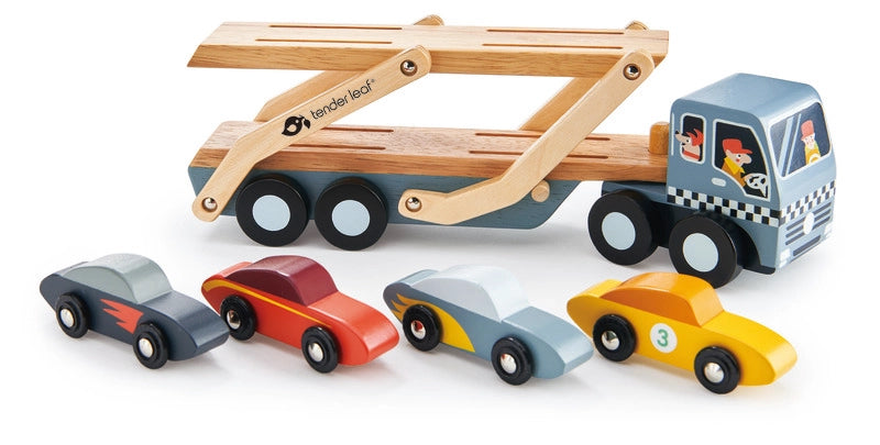 A stunning wooden retro car transporter truck with 4 wooden cars.