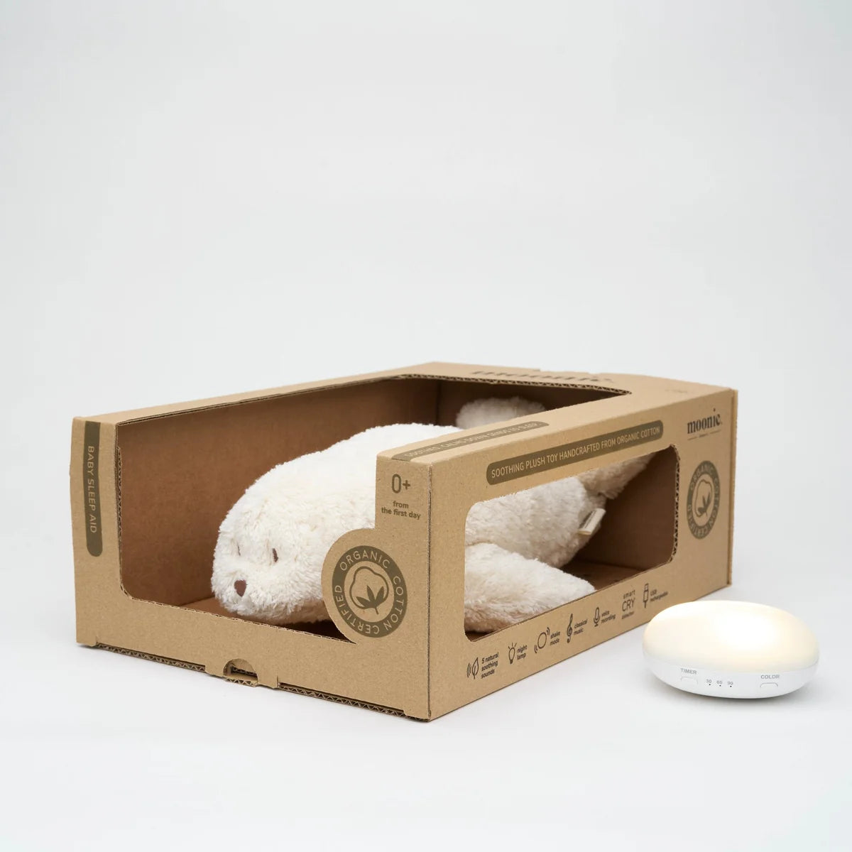 The MOONIE Humming Bear, Humming Seal and Humming Bunny have an intelligent crying sensor, designed for situations in which the baby suddenly wakes up from sleep.