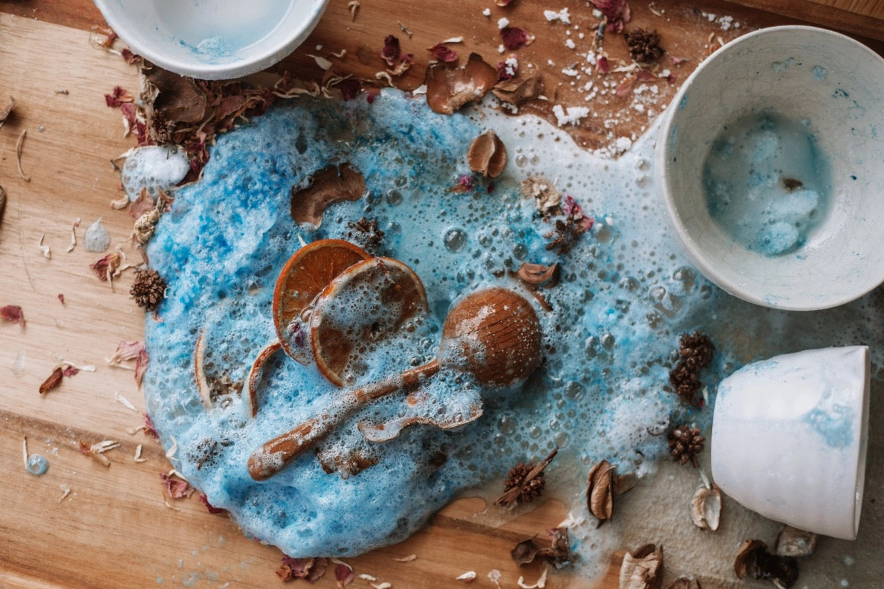 Use The Saltwater Collective fizz in your mud kitchen, add leaves, twigs and flowers or whatever you can forage from your garden and make your own potion magic, bottle it up to keep your potions magic active.
