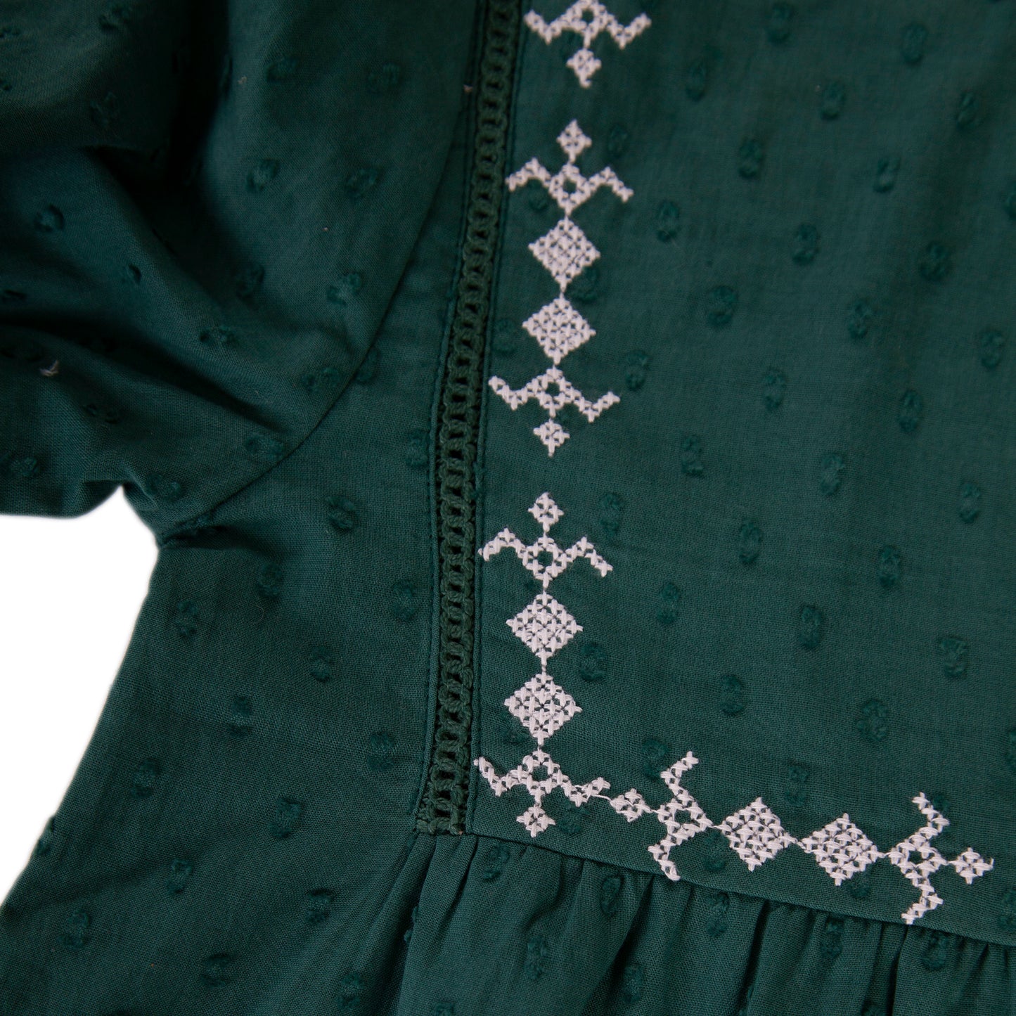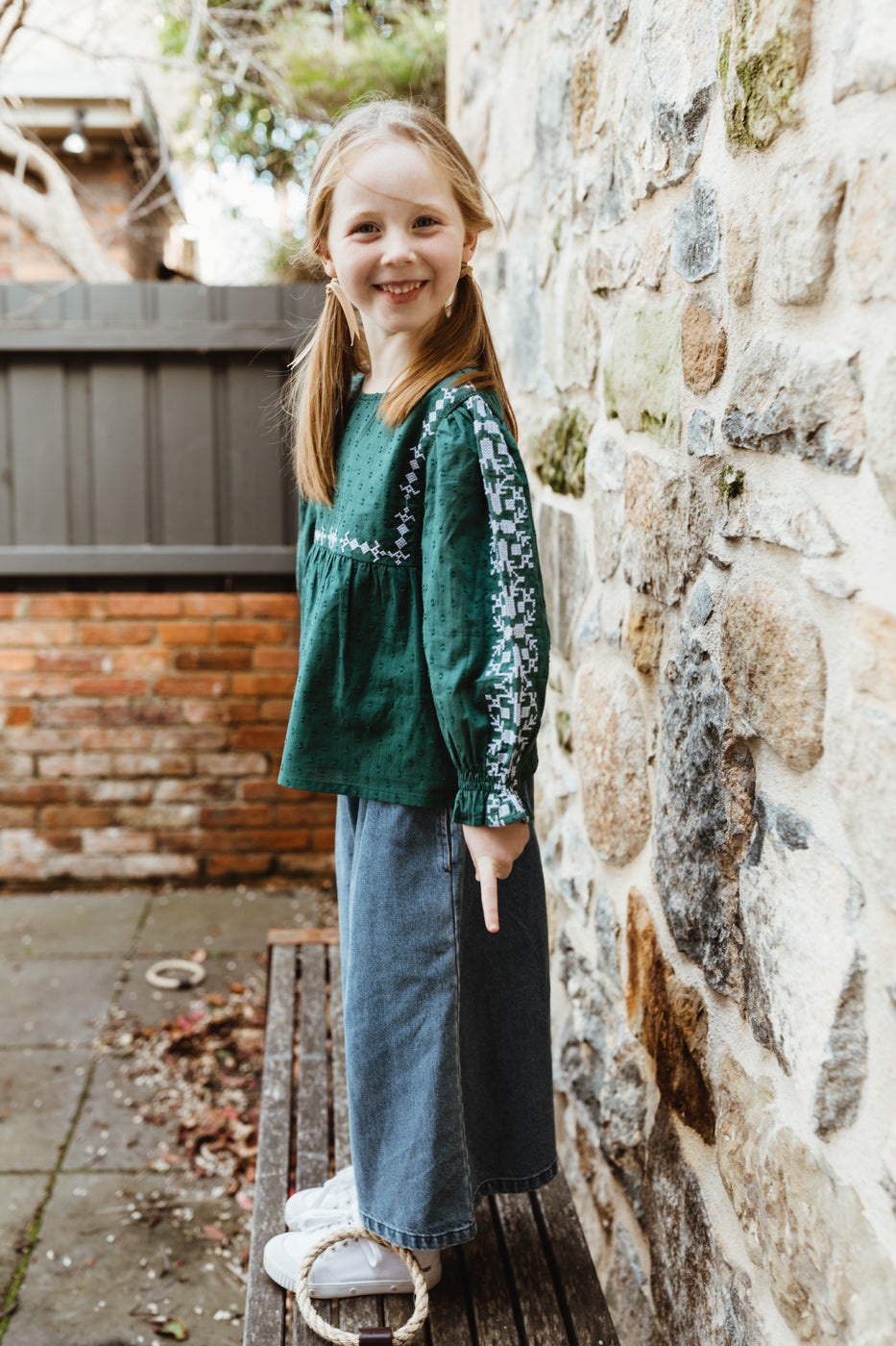 Regular price $39.97Lined textured "dot" cotton doby shirt in silverpine with contrast white embroidery detail on yoke and sleeve. Slight gather at shoulder, and elastic frill sleeve. Gorgeous back with the Blake denim culottes.