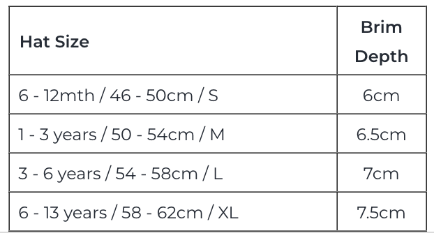 Step 3: Choose a hat size with the smallest measurement closest to your child's head measurement. Our Wanderer Panelled Bucket Hats have adjustable ties in the crown to get the perfect fit to your child's head size with a 4cm range in each hat. By choosing the smallest size of the range, you will get the most wear out of it.