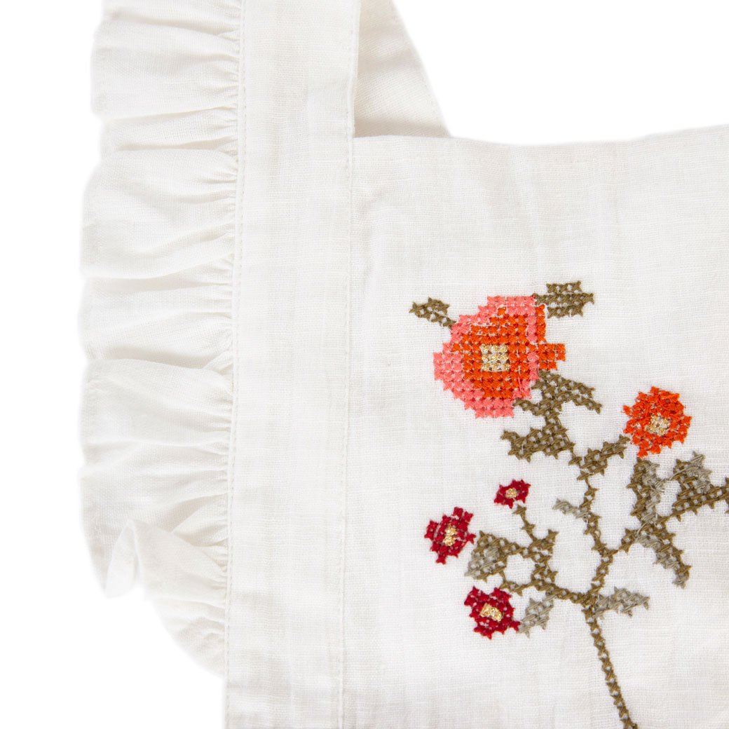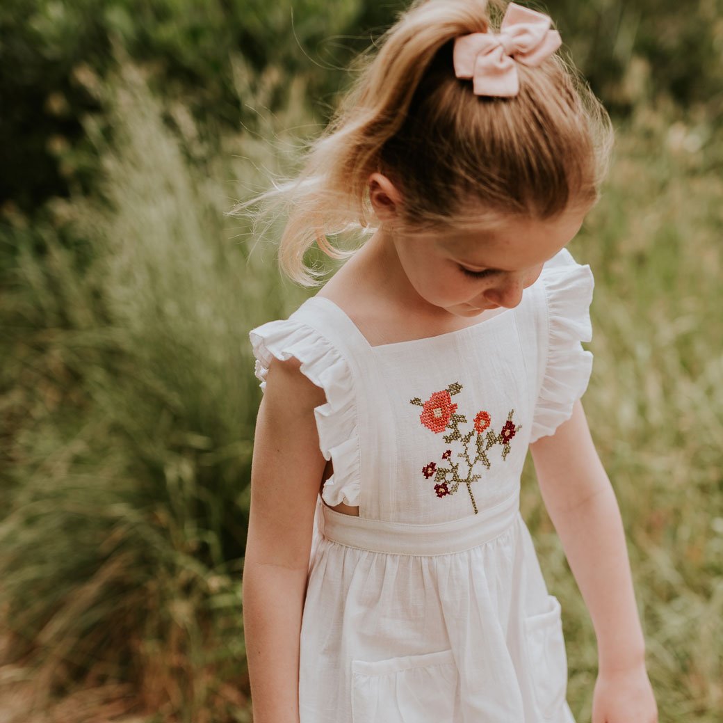 Regular price $34.97Cotton flax pinafore with contrast embroidery in white, wooden buttons and frill detail.