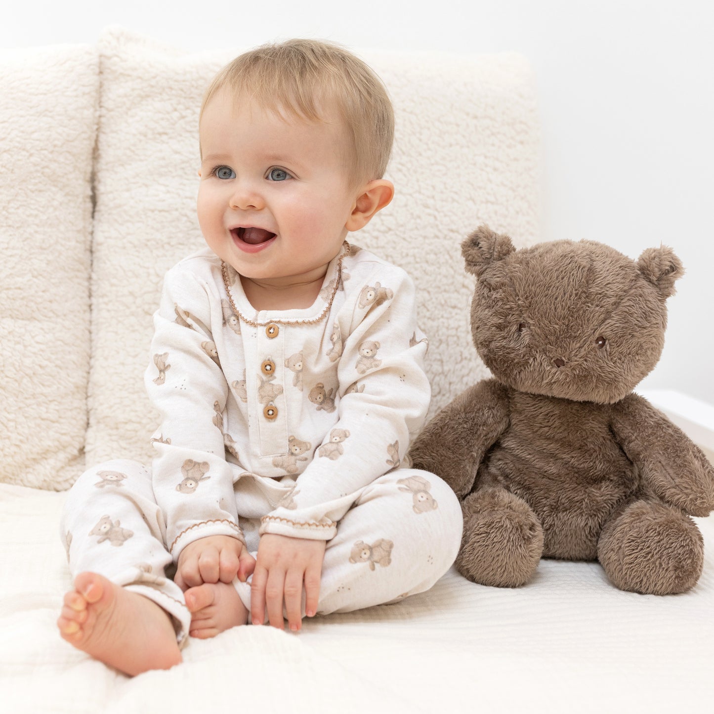 Made with soft organic cotton, this baby onesie is perfect for snuggling and features an adorable teddy bear print and scalloped knit edging around the collar.