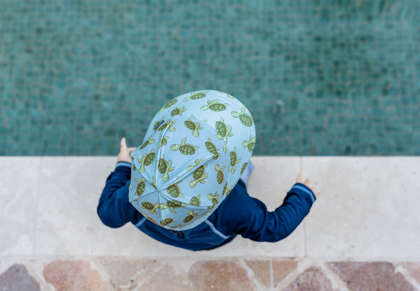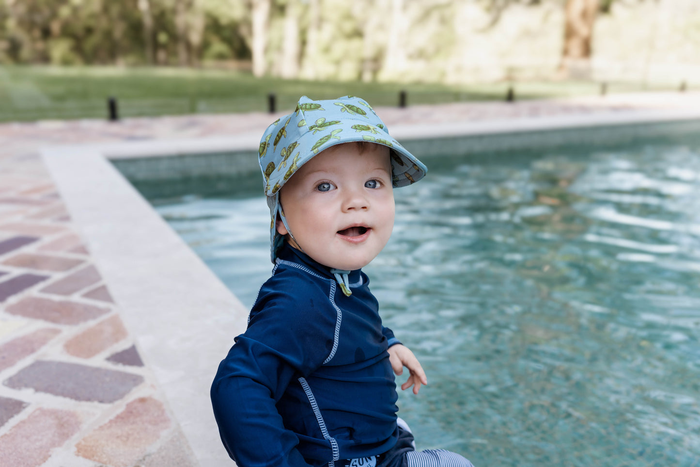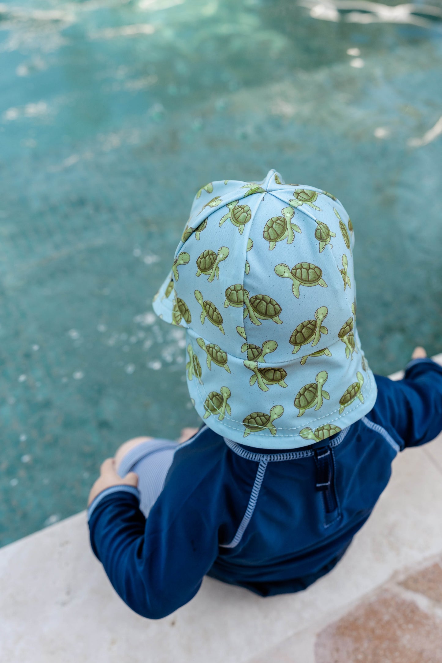 Meet the friendliest turtle in the sea! Our Sheldon print is full of character, with cheerful green turtles paddling through a soft blue ocean, speckled with salty flecks. Bright, fun and full of joy—this is a hat little ones will love to wear.