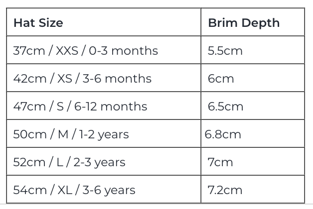 - Sun-Smart recommended brim depths (see tab below for measurements)