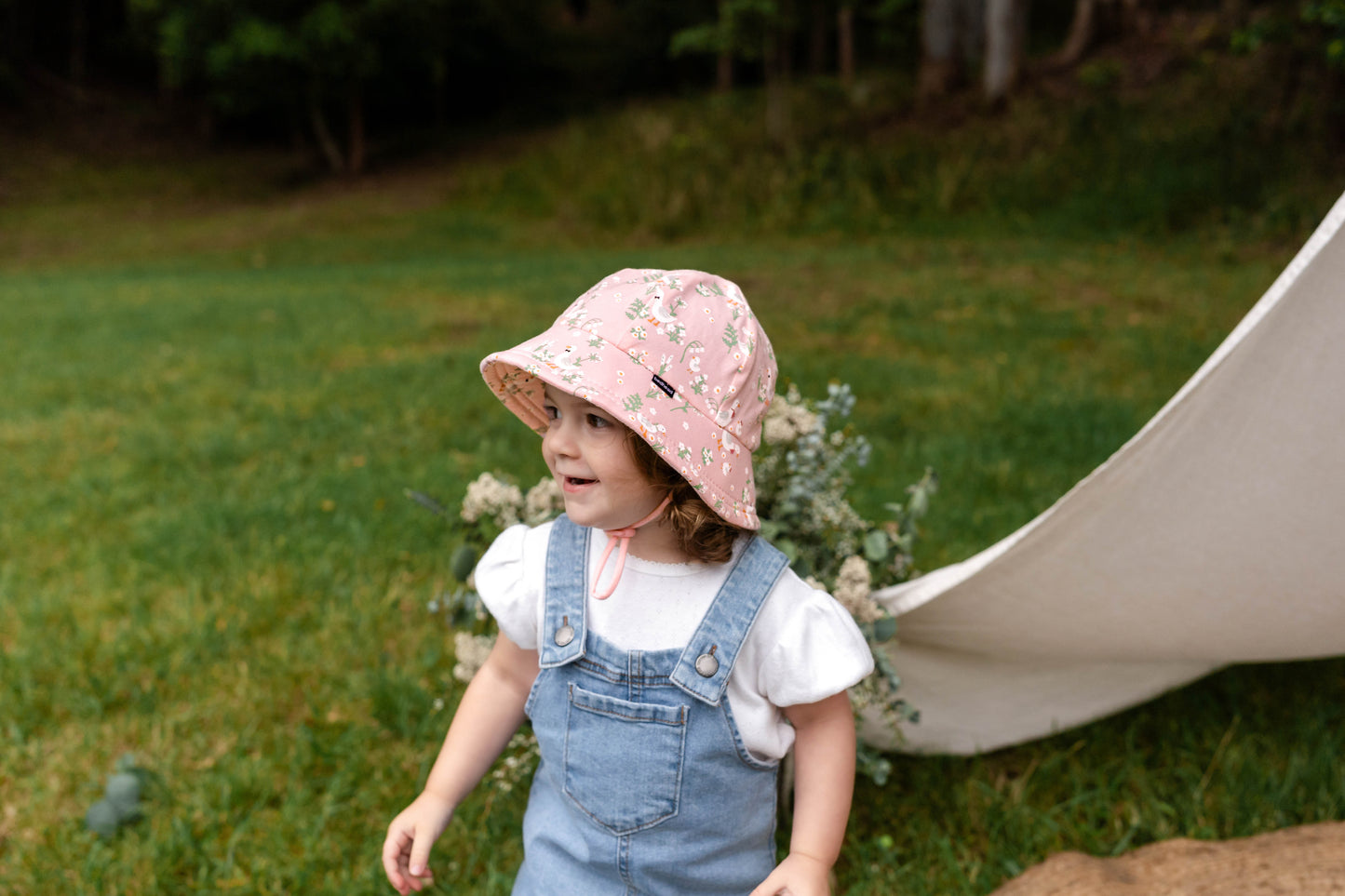 The Bedhead Toddler Bucket Hat in QUACKERS features cheerful white ducks and tiny ducklings scattered among pastel florals on a soft pink background. The flexible brim gently shields little faces while giving curious toddlers a clear view of the world around them.