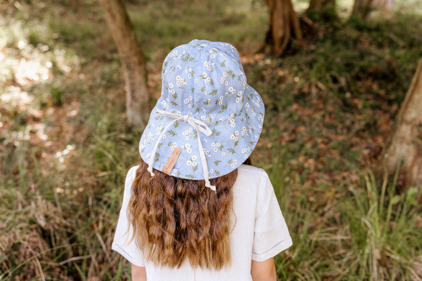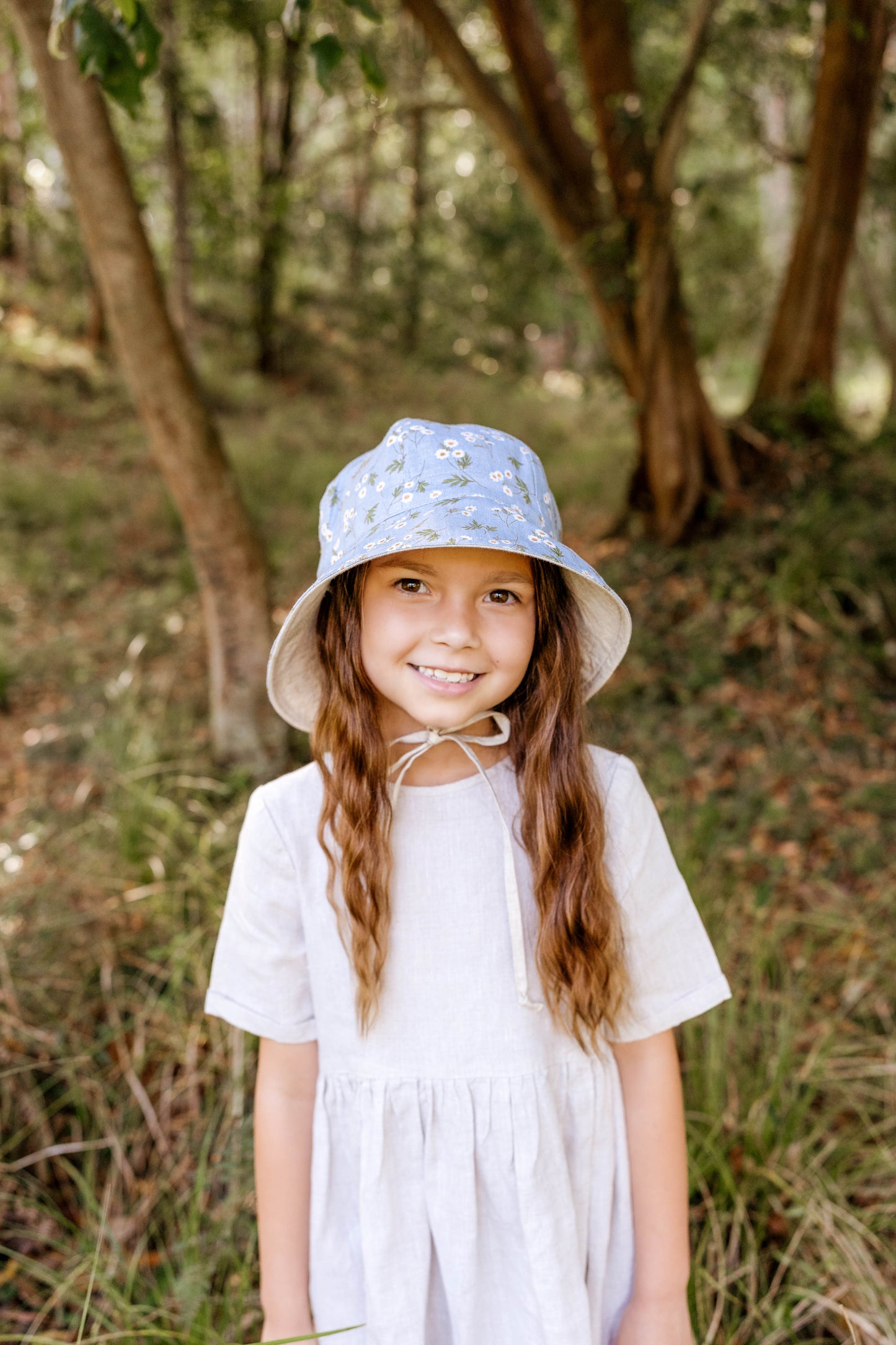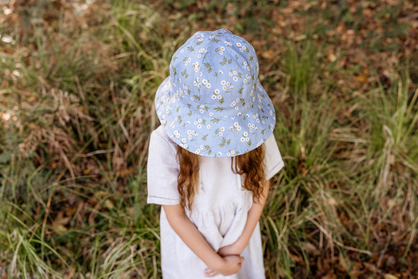Light and lovely, our Daisy print is pure picnic-day perfection. The classic combo of white florals and soft blue sky makes this hat a go-to for every sunny outing. It’s fully reversible with a calming flax linen for a toned-down option, giving versatility and timeless style in one