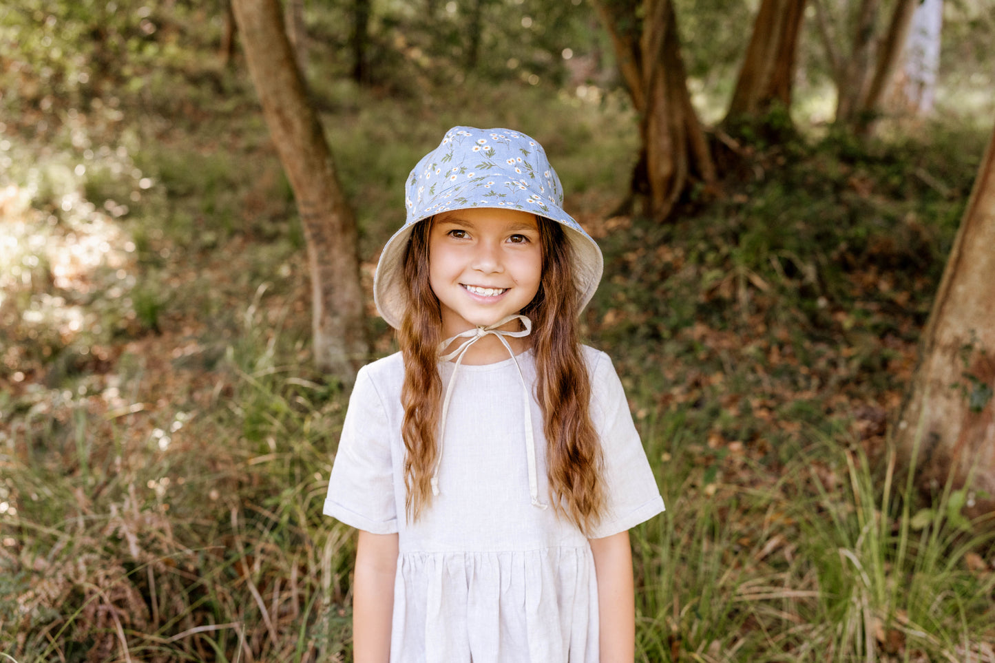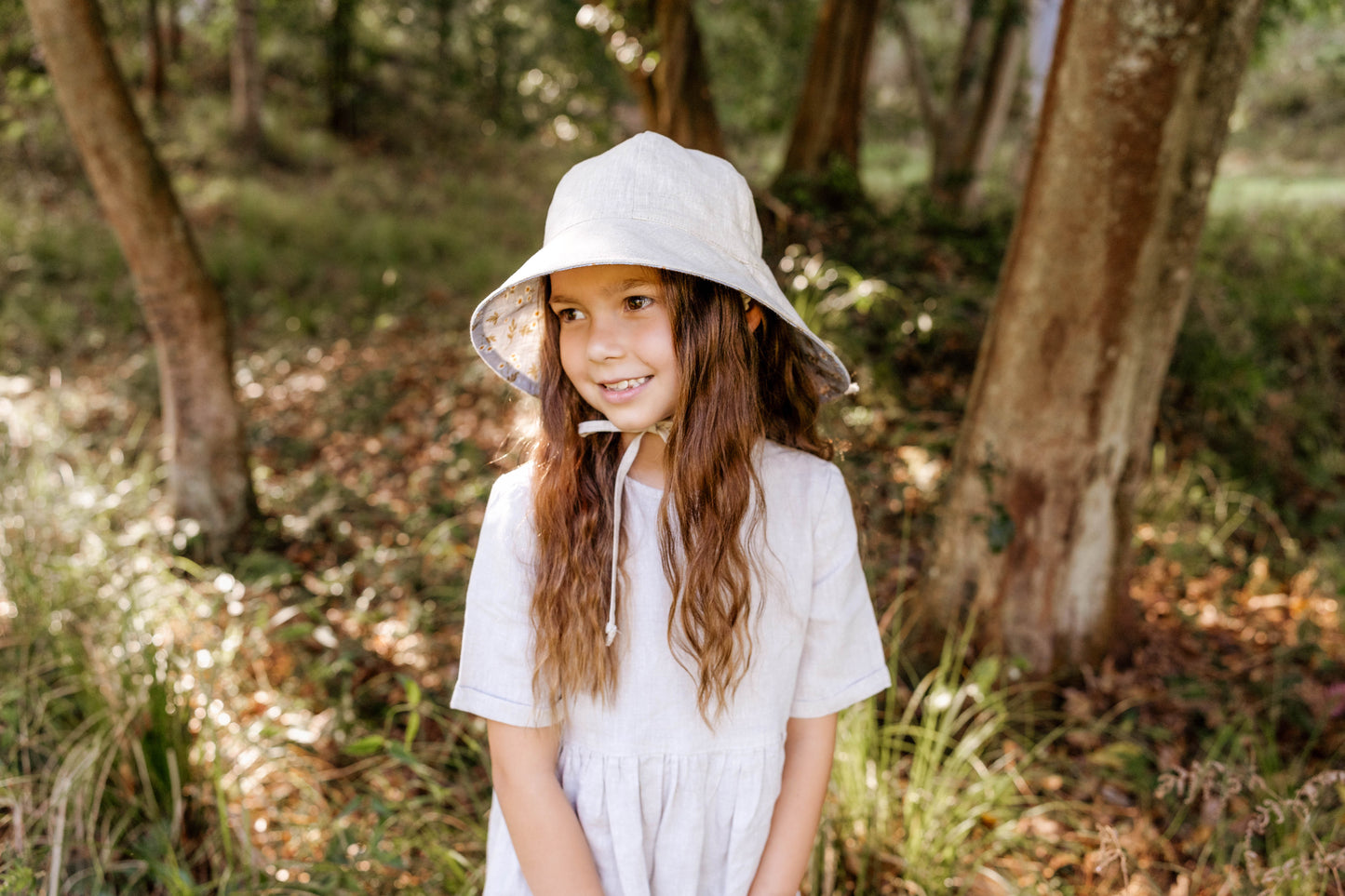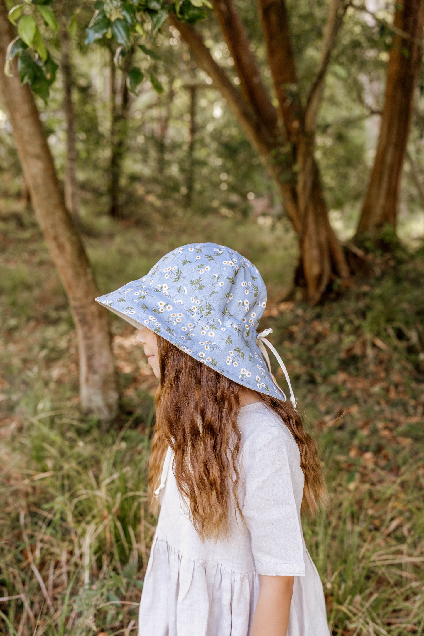 Light and lovely, our Daisy print is pure picnic-day perfection. The classic combo of white florals and soft blue sky makes this hat a go-to for every sunny outing. It’s fully reversible with a calming flax linen for a toned-down option, giving versatility and timeless style in one