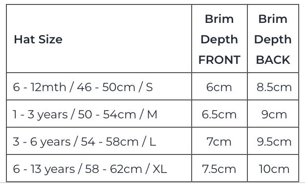 Step 3: Choose a hat size with the smallest measurement closest to your child's head measurement. Our Wanderer Panelled Bucket Hats have adjustable ties in the crown to get the perfect fit to your child's head size with a 4cm range in each hat. By choosing the smallest size of the range, you will get the most wear out of it.