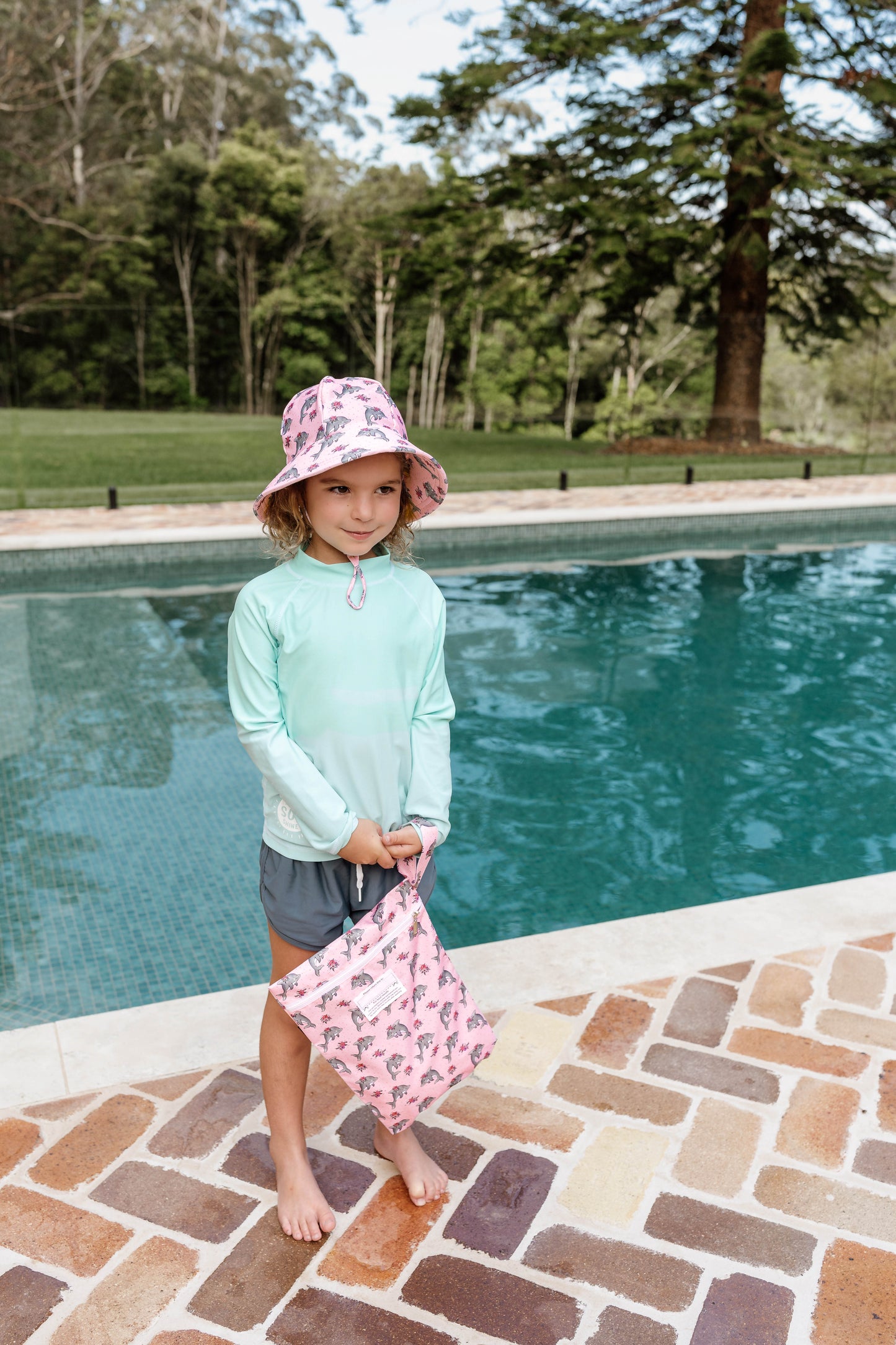 Dive into delightful with our Dolphin print Wet Bag! Featuring a parade of flower-crowned dolphins drifting across a blush pink backdrop, it’s the sweetest way to carry wet swimmers, beachwear or towels in style.