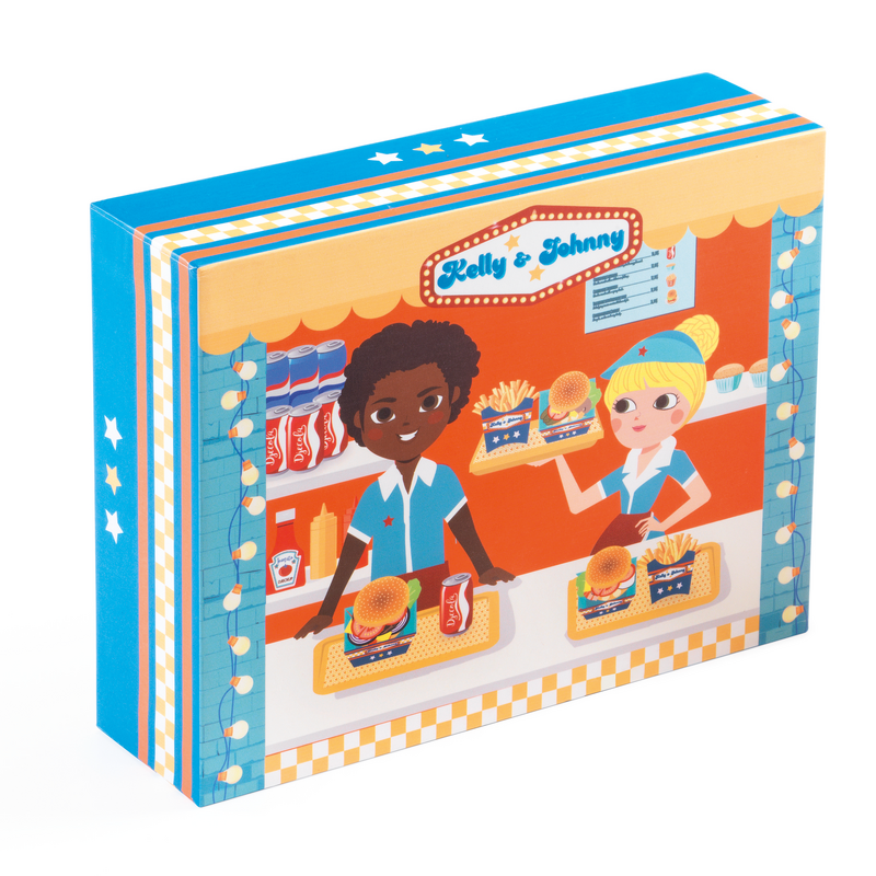 Contents: 1 can, 1 bottle of tomato sauce, 8 ingredients, 1 burger box, 6 wooden fries with 1 cardboard cone, 1 menu card, and 1 wooden storage box.