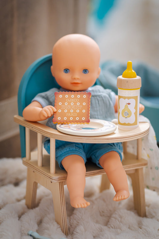 The meal is an essential moment in a doll’s day. The little wooden barred chair is perfect for feeding your baby doll. It is compact and fits perfectly in a child’s bedroom. Suitable for dolls of 30 to 34 cm.